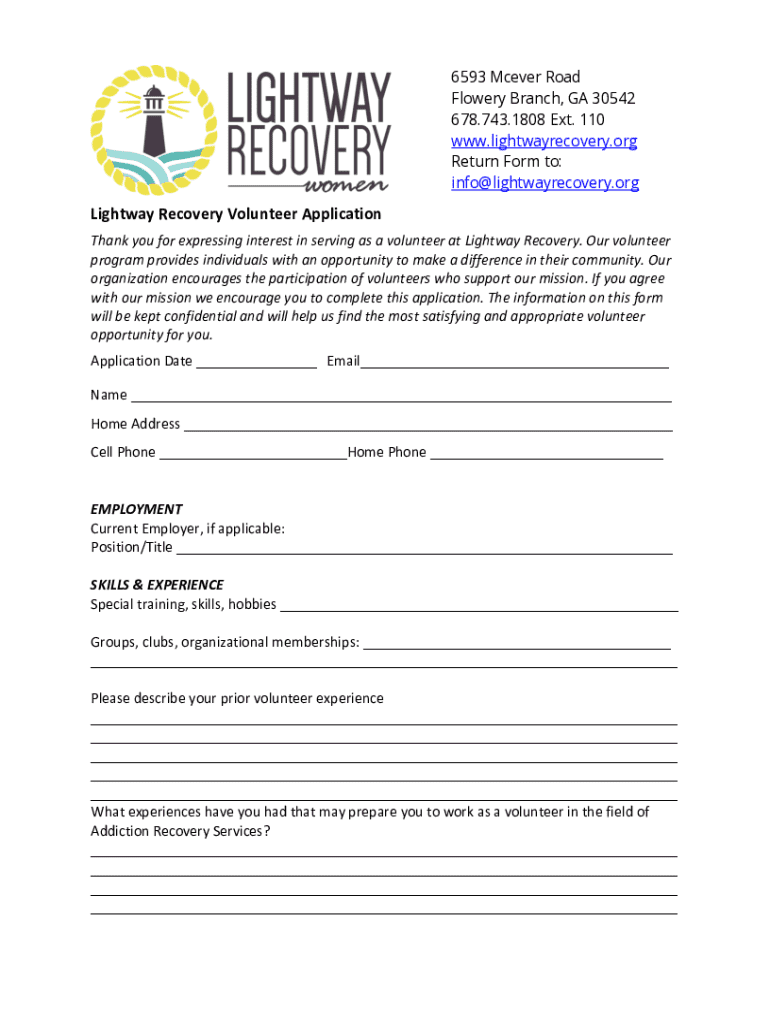 6593 Mcever Road Flowery Branch, GA 30542 678.743.1808 Ext. 110 www.lightwayrecovery.org Return Form to: info@lightwayrecovery.orgLightway Recovery Volunteer Application Thank you for expressing interest