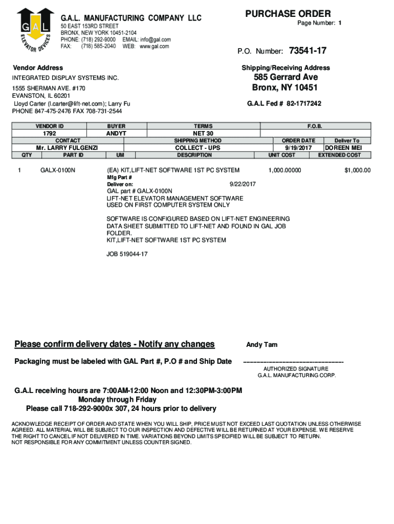 PURCHASE ORDER Page Number: 1P.O. Number: Vendor AddressShipping/Receiving Address585 Gerrard Ave Bronx, NY 10451INTEGRATED DISPLAY SYSTEMS INC. 1555 SHERMAN AVE. #170 EVANSTON, IL 60201 Lloyd Carter