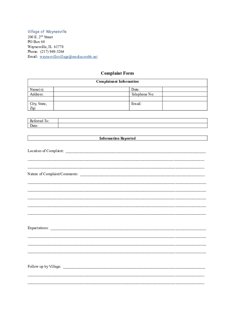 Village of Waynesville 200 E. 2nd Street PO Box 60 Waynesville, IL 61778 Phone: (217) 9493264 Email: waynesvillevillage@mediacombb.netComplaint Form Complainant Information Name(s): Address:Date: