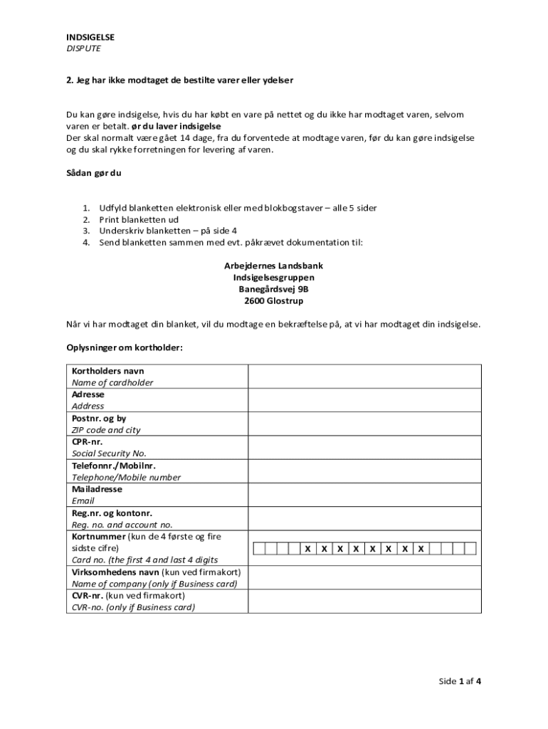 To fill out indsigelser mod betalinger, one must provide personal identification information, details of the disputed transaction, including transaction date, amount, and a description of the issue.