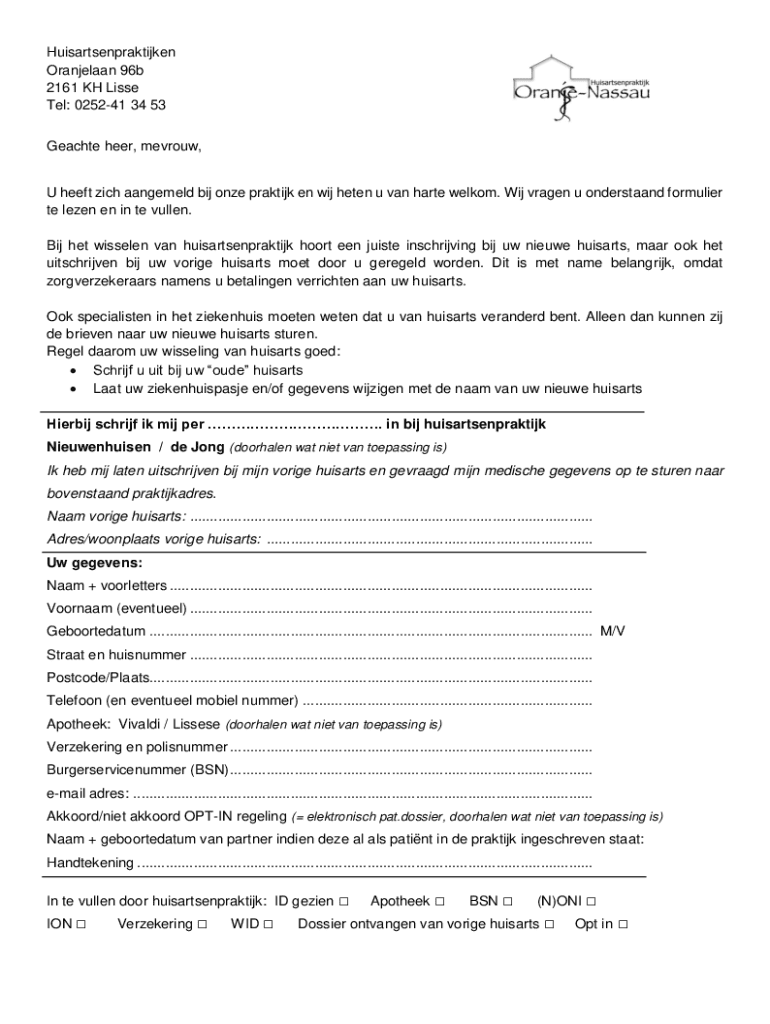 Huisartsenpraktijken Oranjelaan 96b 2161 KH Lisse Tel: 025241 34 53 Geachte heer, mevrouw,U heeft zich aangemeld bij onze praktijk en wij heten u van harte welkom. Wij vragen u onderstaand formulier