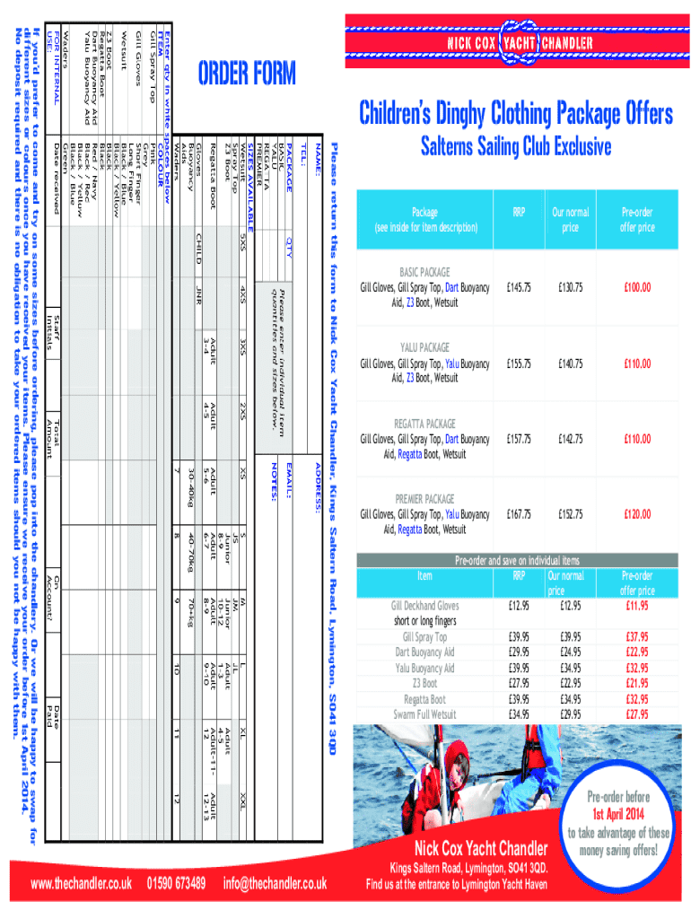 Childrens Dinghy Clothing Package Offers Please return this form to Nick Cox Yacht Chandler, Kings Saltern Road, Lymington, SO41 3QDIf youd prefer to come and try on some sizes before ordering, please