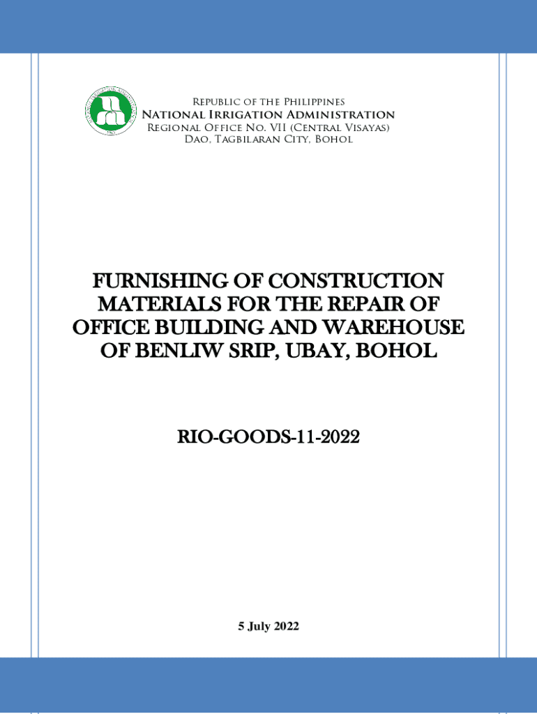 Republic of the PhilippinesNational Irrigation Administration Regional Office No. VII (Central Visayas) Dao, Tagbilaran City, BoholFURNISHING OF CONSTRUCTION MATERIALS FOR THE REPAIR OF OFFICE BUILDING