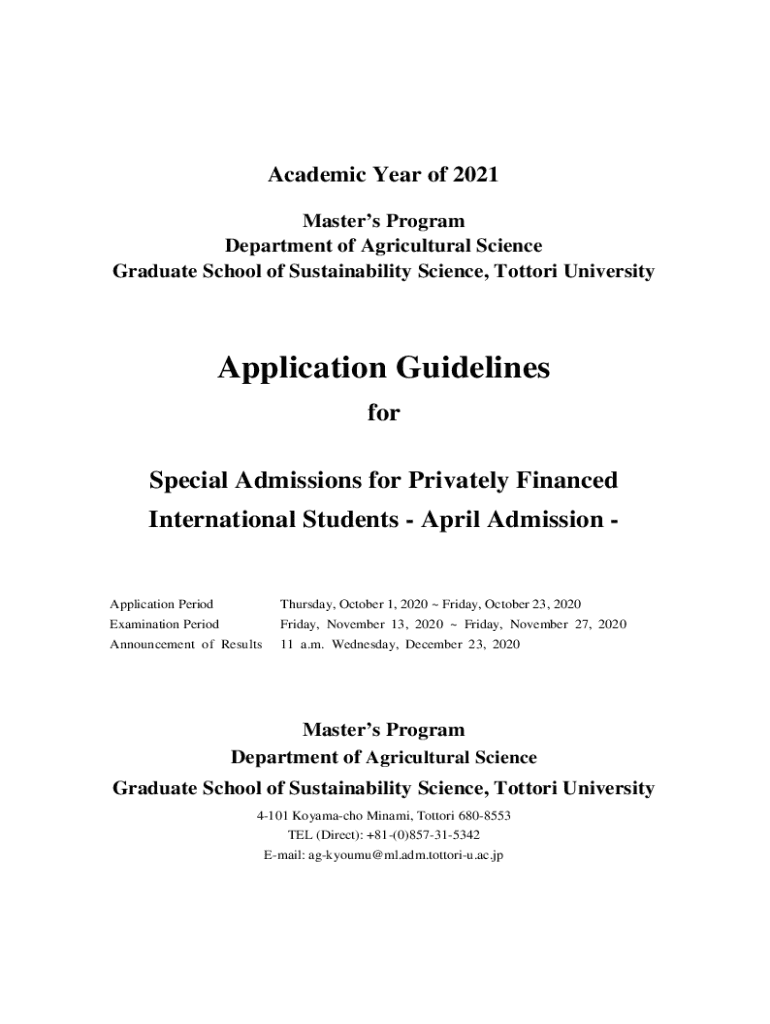 This document outlines the application process, requirements, and guidelines for privately financed international students applying to the Master\'s Program in Agricultural Science at Tottori University for the academic year 2021.