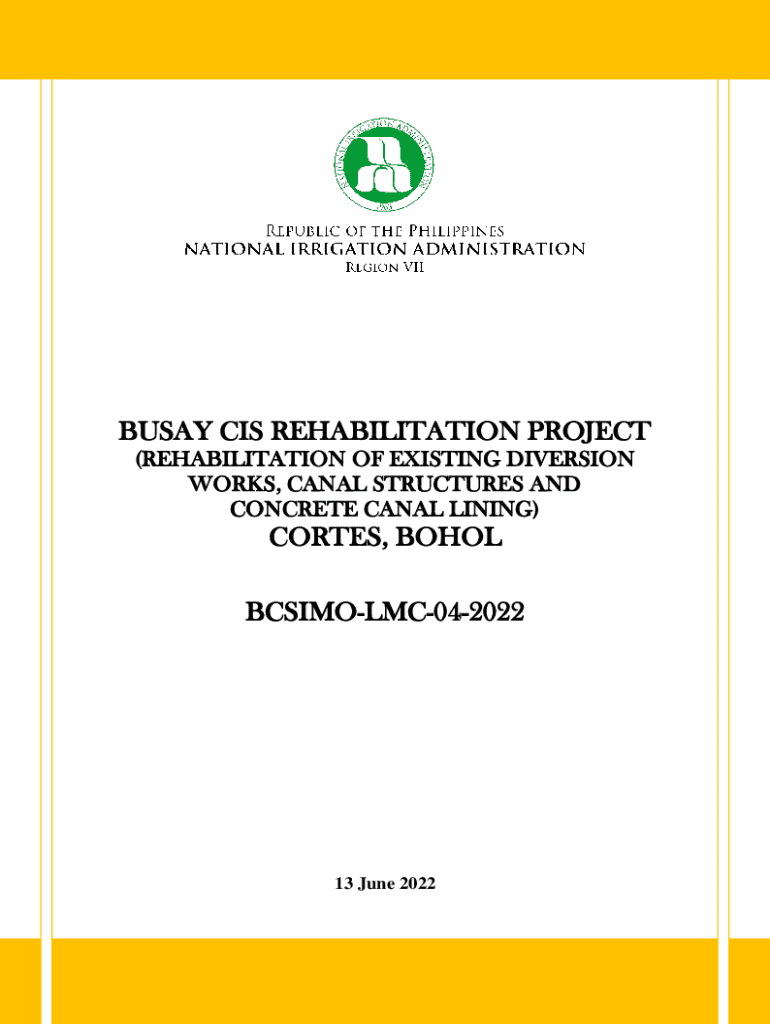 BUSAY CIS REHABILITATION PROJECT (REHABILITATION OF EXISTING DIVERSION WORKS, CANAL STRUCTURES AND CONCRETE CANAL LINING)CORTES, BOHOL BCSIMOLMC04202213 June 20221TABLE OF CONTENTS Glossary of Terms,