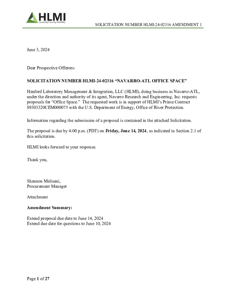 This document outlines the solicitation for proposals for office space from prospective offerors by Hanford Laboratory Management & Integration, LLC (HLMI) in support of a contract with the U.S. Department of Energy. It includes details about the proposal submission, evaluation criteria, and requirements for the lease of a Class A facility.