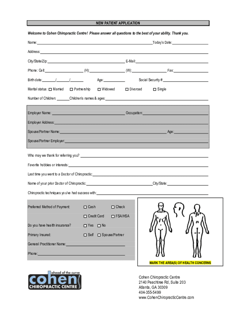 This document is a new patient application form for the Cohen Chiropractic Centre. It gathers essential information from new patients, including personal details, health history, insurance information, and reasons for visiting the chiropractic office.