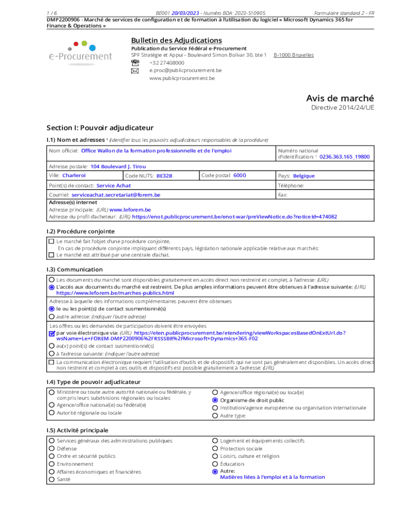 1/6 BE001 20/03/2023 Numro BDA: 2023510905 Formulaire standard 2 FR DMP2200906 March de services de conguration et de formation lutilisation du logiciel Microsoft Dynamics 365 for Finance & Operations