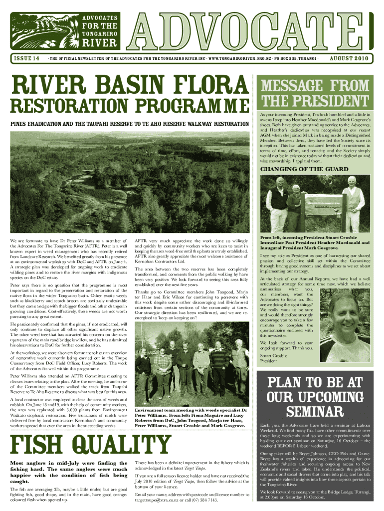 ISSUE 14 THE official newsletter of the advocates for the tongariro river inc www.tongariroriver.org.NZ PO Box 335, turangi AUGUST 2010From River Basin Flora MESSAGE the PRESIDENTRestoration ProgramME