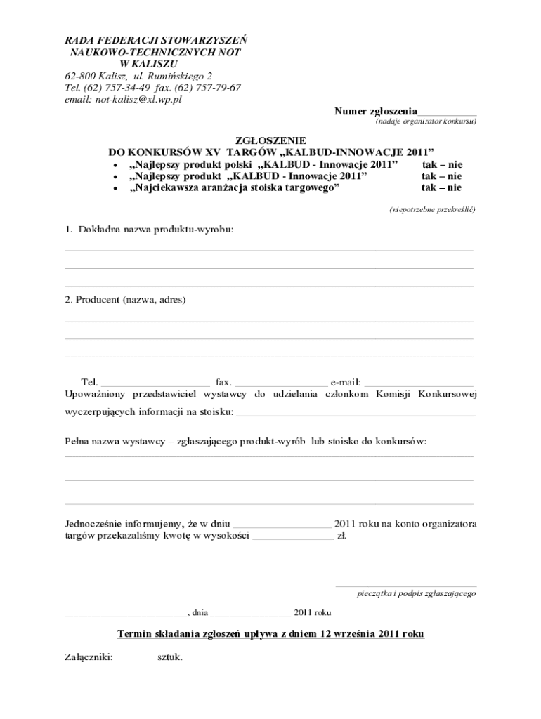 RADA FEDERACJI STOWARZYSZE NAUKOWOTECHNICZNYCH NOT W KALISZU 62800 Kalisz, ul. Rumiskiego 2 Tel. (62) 7573449 fax. (62) 7577967 email: notkalisz@xl.wp.pl Numer zgoszenia___ (nadaje organizator konkursu)ZGOSZENIE
