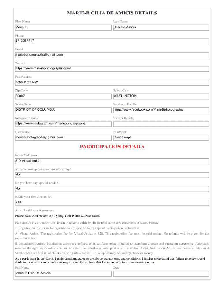 MARIEB CILIA DE AMICIS DETAILS First NameLast NameMarieBCilia De AmicisPhone 5713387717 Email mariebphotographs@gmail.com Website https://www.mariebphotographs.com/ Full Address 2609 P ST NW Zip CodeSelect