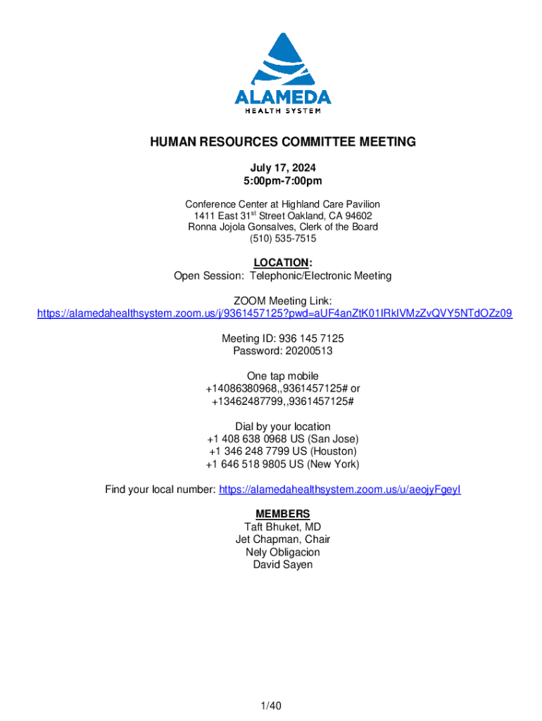 This document outlines the agenda for the Human Resources Committee Meeting of the Alameda Health System, held on July 17, 2024. It includes information on the meeting\'s time, location, members present, as well as public comment instructions, key discussion topics, and additional procedural notes. The document also highlights the mission, strategic vision, and values of the organization.
