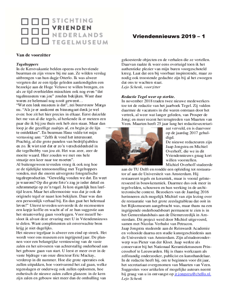 Vriendennieuws 2019 1Van de voorzitter Tegeltoppers In de Kerstvakantie belden opeens een bevriende buurman en zijn vrouw bij me aan. Ze wilden verslag uitbrengen van hun dagje Otterlo. Ik was alweer