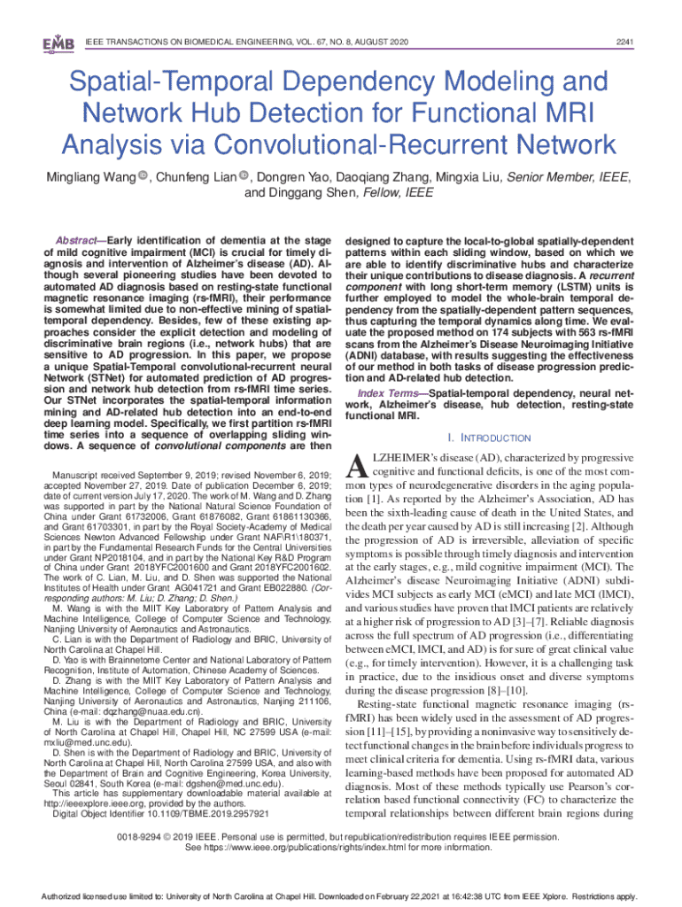 IEEE TRANSACTIONS ON BIOMEDICAL ENGINEERING, VOL. 67, NO. 8, AUGUST 20202241SpatialTemporal Dependency Modeling and Network Hub Detection for Functional MRI Analysis via ConvolutionalRecurrent Network