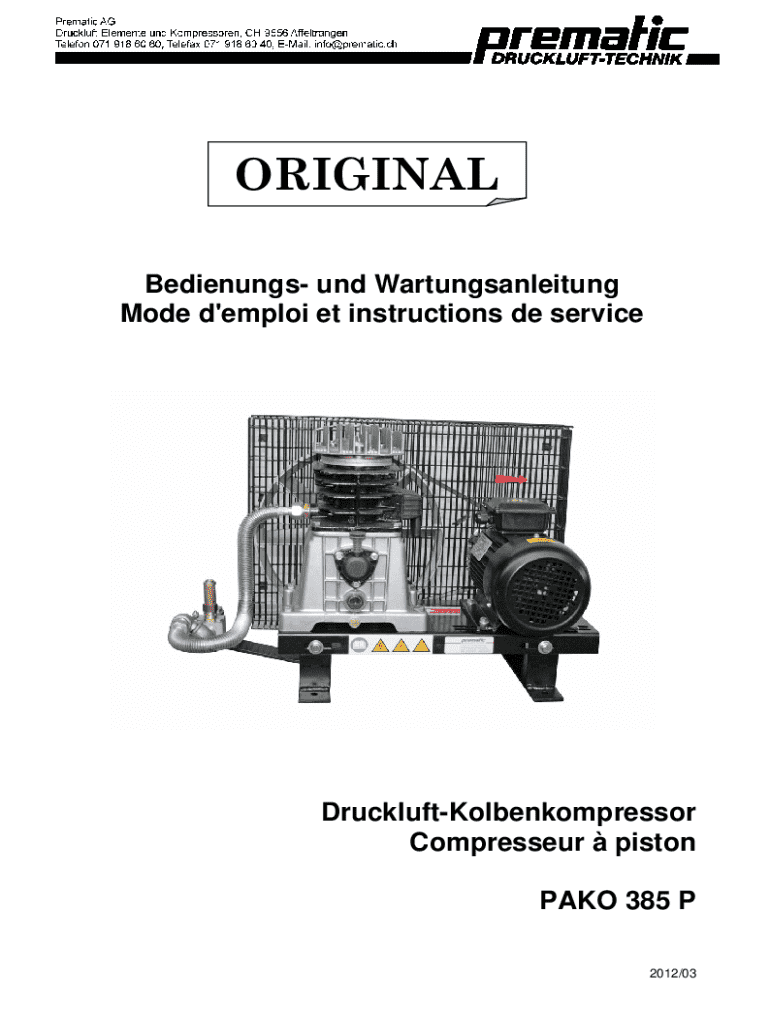 ORIGINAL Bedienungs und Wartungsanleitung Mode d\'emploi et instructions de serviceDruckluftKolbenkompressor Compresseur piston PAKO 385 P 2012/031. 2. 3. 4. 5.6.7. 8.Technische Daten ........................................................................