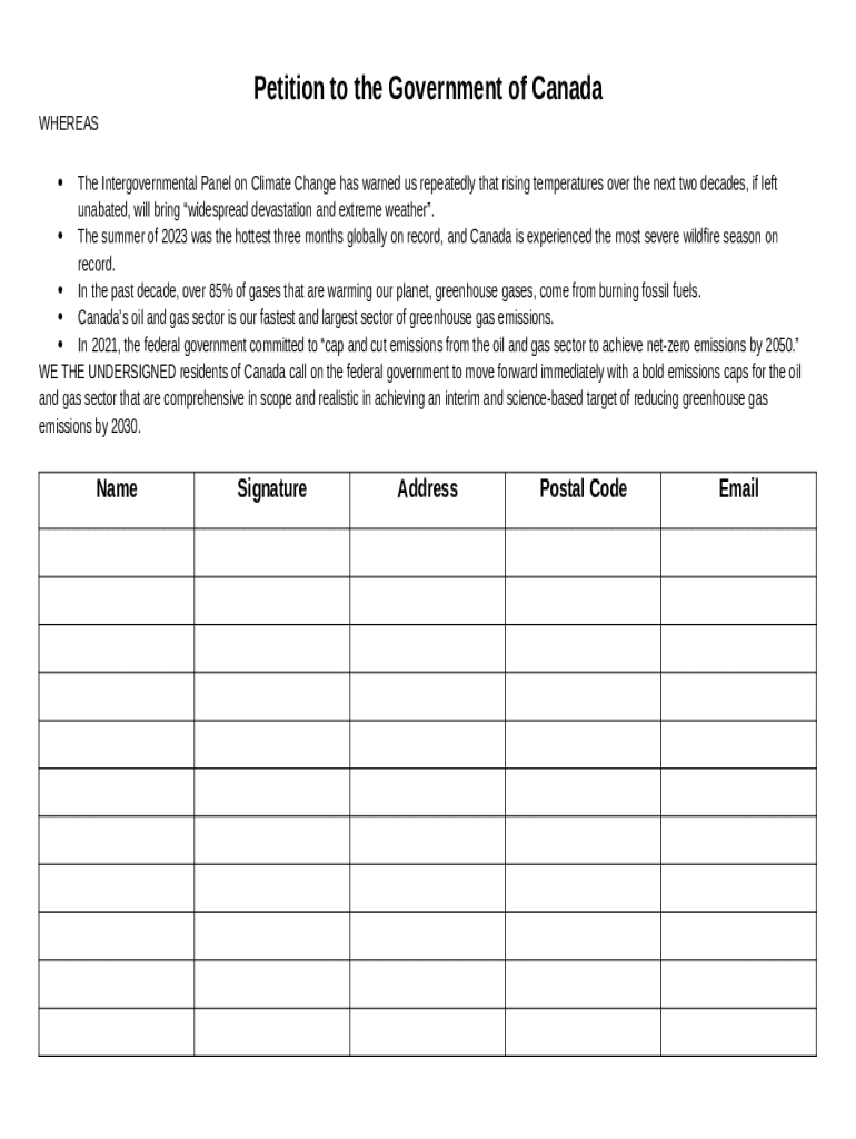 The Petition to the Government of Canada - canada citizensclimatelobby is a document you can get filled-out and signed for certain needs. Then, it is provided to the actual addressee to provide some info of certain kinds. The completion and signing is possible in hard copy or with an appropriate tool like PDFfiller. Such tools help to send in any PDF or Word file without printing out. While doing that, you can edit its appearance according to the needs you have and put an official legal e-signature. Once finished, the user sends the Petition to the Government of Canada - canada citizensclimatelobby to the respective recipient or several recipients by email or fax. PDFfiller includes a feature and options that make your blank printable. It offers a number of options when printing out appearance. It does no matter how you file a form after filling it out - in hard copy or by email - it will always look professional and clear. In order not to create a new document from scratch over and over, make the original document as a template. After that, you will have a customizable sample.