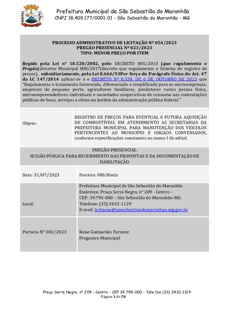 Prefeitura Municipal de So Sebastio do Maranho CNPJ 18.409.177/000101 So Sebastio do Maranho MGPROCESSO ADMINISTRATIVO DE LICITAO N 054/2023 PREGO PRESENCIAL N 023/2023 TIPO: MENOR PREO POR ITEM Regido