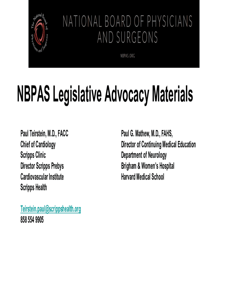 NBPAS legislative advocacy materials refer to documents and resources created by the National Board of Physicians and Surgeons that outline their positions, proposals, and information regarding legislative issues affecting the medical profession.