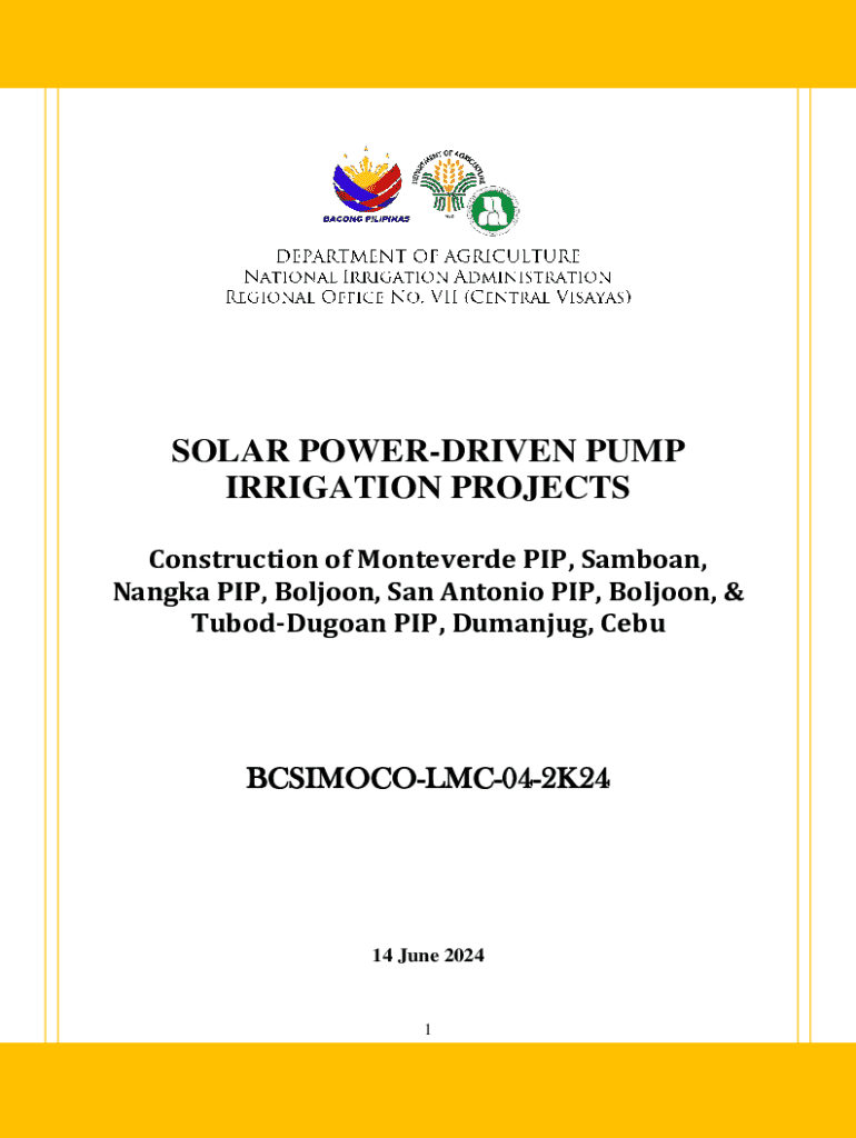SOLAR POWERDRIVEN PUMP IRRIGATION PROJECTS Construction of Monteverde PIP, Samboan, Nangka PIP, Boljoon, San Antonio PIP, Boljoon, & TubodDugoan PIP, Dumanjug, CebuBCSIMOCOLMC042K2414 June 20241TABLE
