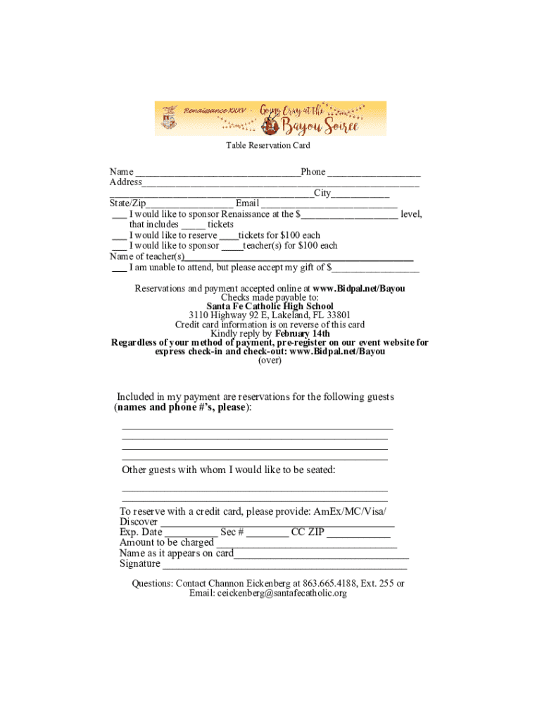 Table Reservation CardName ___Phone ___ Address___ ___City___ State/Zip___ Email ___ I would like to sponsor Renaissance at the $___ level, that includes ___ tickets I would like to reserve tickets