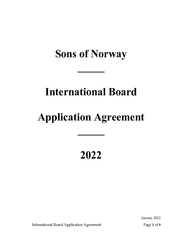 This document serves as an application agreement for candidates aspiring to become International or Alternate International Directors of Sons of Norway. It outlines the responsibilities, legal obligations, and ethical standards expected from board members, emphasizing the importance of corporate governance, confidentiality, and the duties of care, loyalty, and obedience.