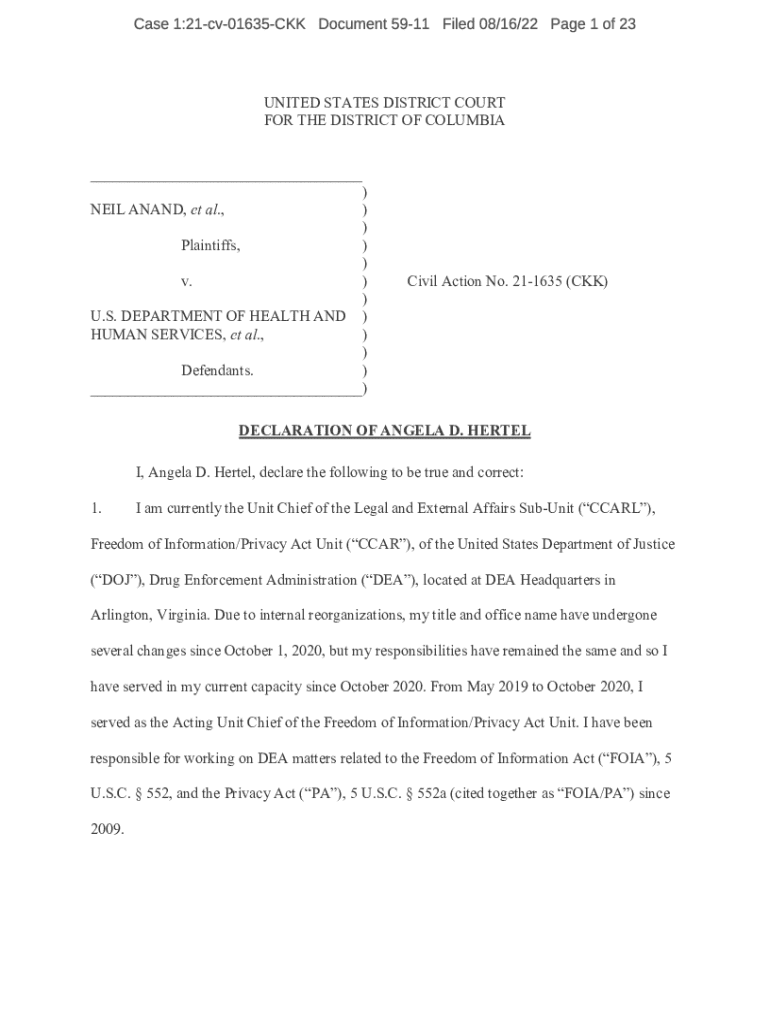 UNITED STATES DISTRICT COURT FOR THE DISTRICT OF COLUMBIA ___ ) NEIL ANAND, et al., ) ) Plaintiffs, ) ) v. ) ) U.S. DEPARTMENT OF HEALTH AND ) HUMAN SERVICES, et al., ) ) Defendants. ) ___)Civil Action
