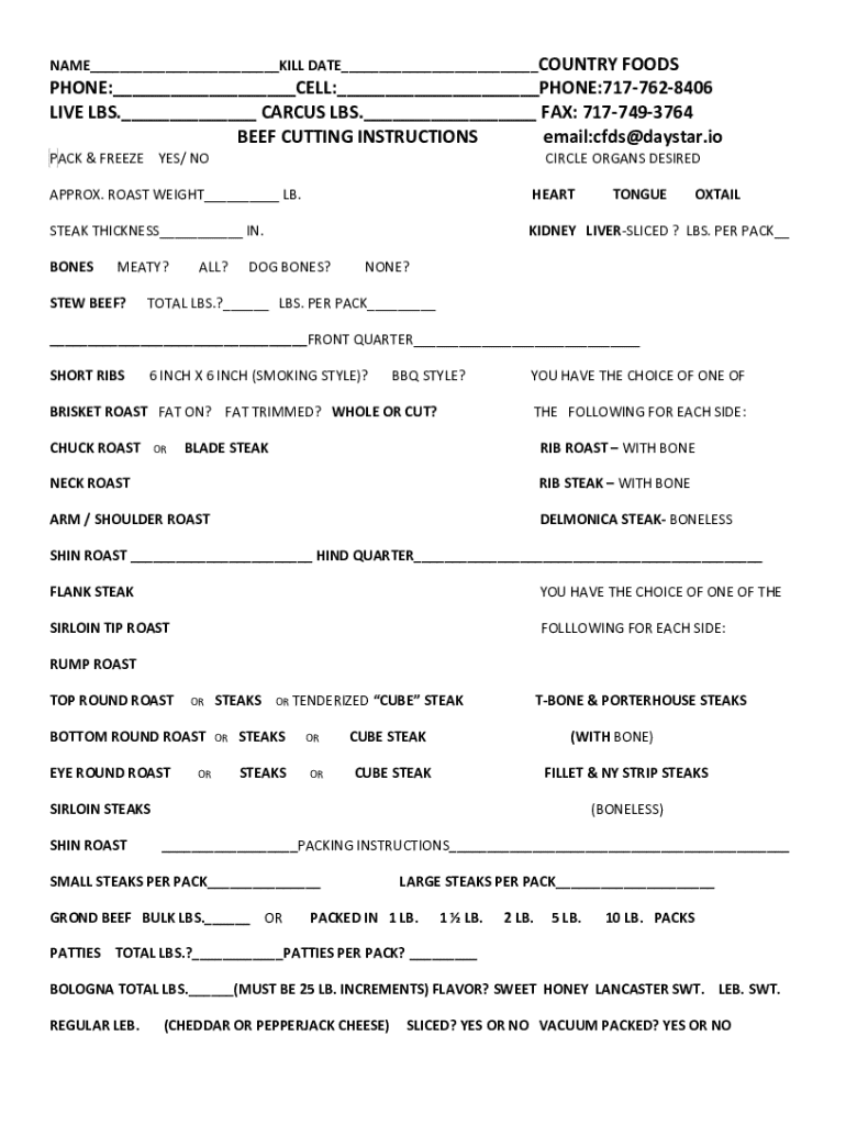 NAME___KILL DATE___COUNTRY FOODSPHONE:___CELL:___PHONE:7177628406 LIVE LBS.___ CARCUS LBS.___ FAX: 7177493764 BEEF CUTTING INSTRUCTIONS email:cfds@daystar.io PACK & FREEZE YES/ NOCIRCLE ORGANS DESIREDAPPROX.