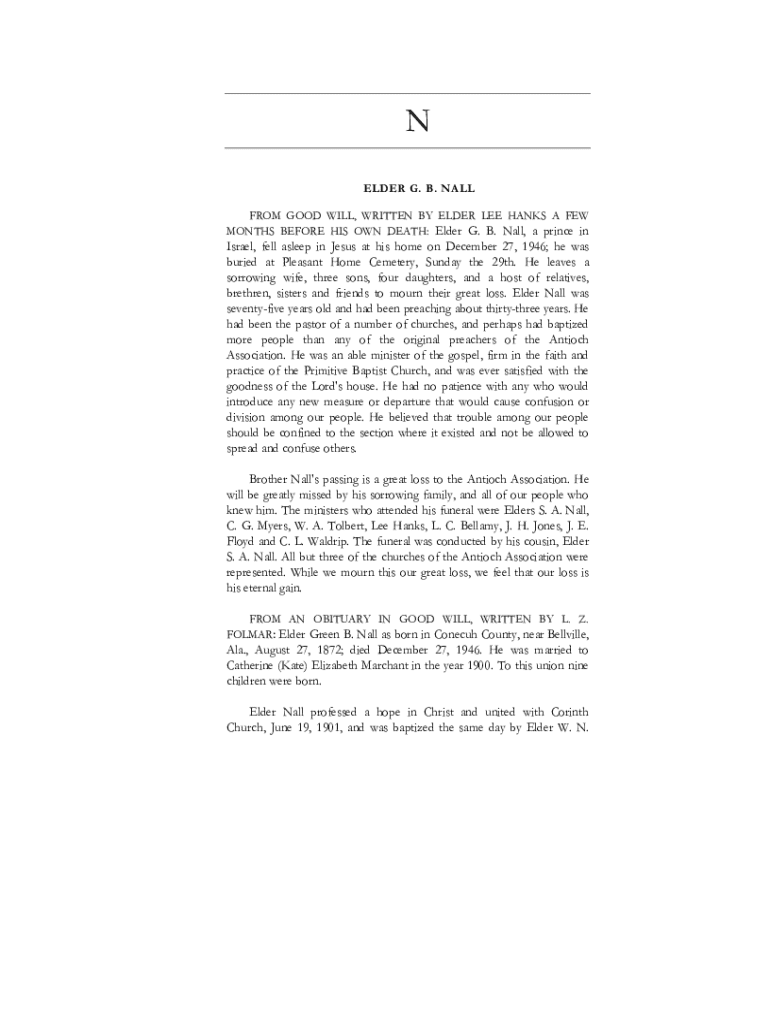 N ELDER G. B. NALL FROM GOOD WILL, WRITTEN BY ELDER LEE HANKS A FEW MONTHS BEFORE HIS OWN DEATH: Elder G. B. Nall, a prince inIsrael, fell asleep in Jesus at his home on December 27, 1946; he was