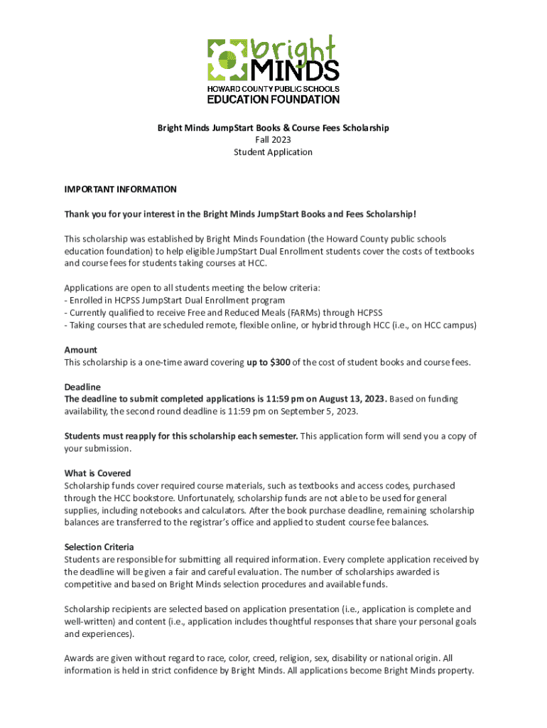 Bright Minds JumpStart Books & Course Fees Scholarship Fall 2023 Student ApplicationIMPORTANT INFORMATION Thank you for your interest in the Bright Minds JumpStart Books and Fees Scholarship! This