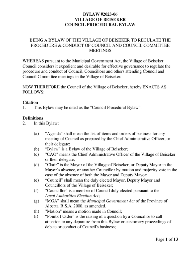 BYLAW #202306 VILLAGE OF BEISEKER COUNCIL PROCEDURAL BYLAWBEING A BYLAW OF THE VILLAGE OF BEISEKER TO REGULATE THE PROCEDURE & CONDUCT OF COUNCIL AND COUNCIL COMMITTEE MEETINGS WHEREAS pursuant to