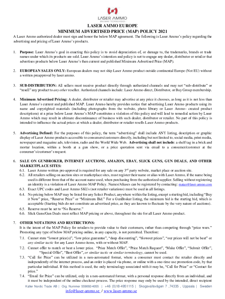 LASER AMMO EUROPE MINIMUM ADVERTISED PRICE (MAP) POLICY 2021 A Laser Ammo authorized dealer must sign and honor the below MAP agreement. The following is Laser Ammos policy regarding the advertising
