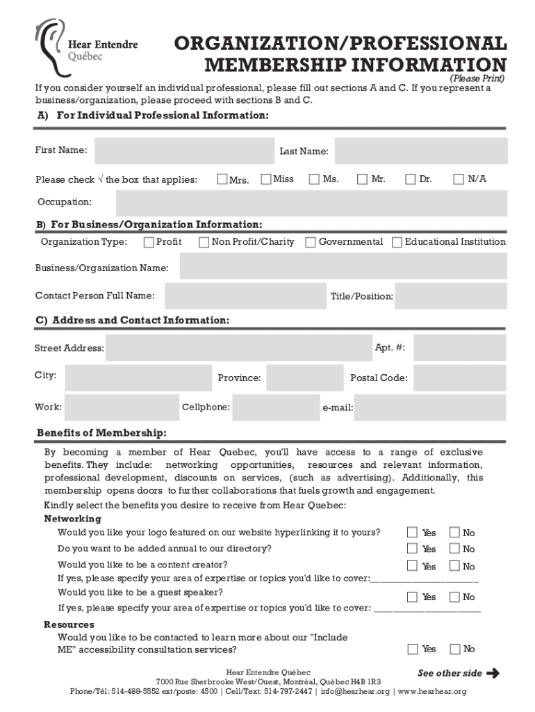 ORGANIZATION/PROFESSIONAL MEMBERSHIP INFORMATION(Please Print) If you consider yourself an individual professional, please fill out sections A and C. If you represent a business/organization, please