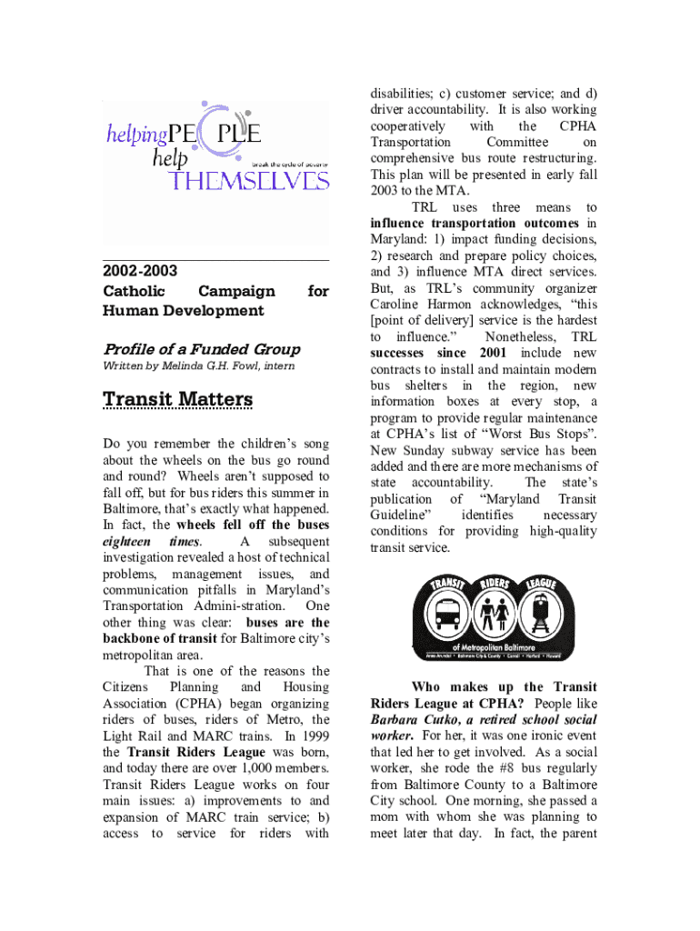 ______20022003 Catholic Campaign Human DevelopmentforProfile of a Funded Group Written by Melinda G.H. Fowl, internTransit Matters Do you remember the childrens song about the wheels on the bus go
