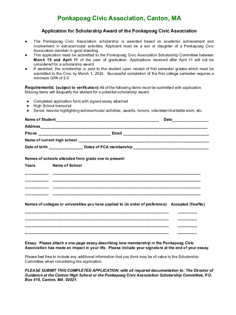 Ponkapoag Civic Association, Canton, MA Application for Scholarship Award of the Ponkapoag Civic Association The Ponkapoag Civic Association scholarship is awarded based on academic achievement and