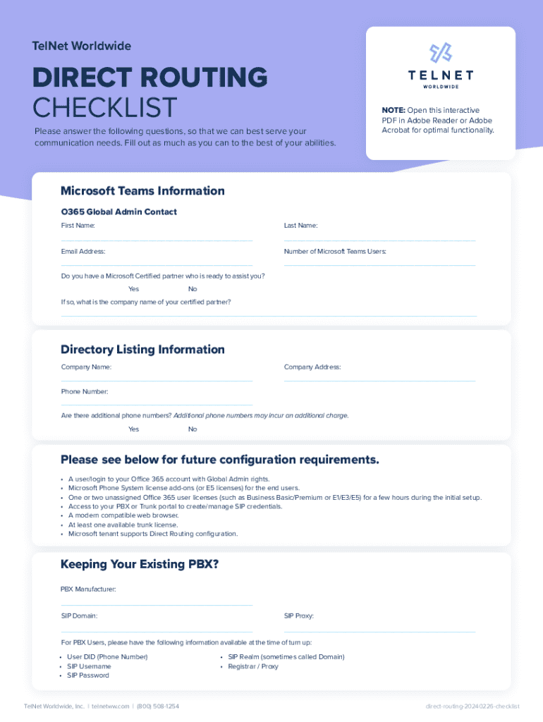 TelNet WorldwideDIRECT ROUTING CHECKLISTPlease answer the following questions, so that we can best serve your communication needs. Fill out as much as you can to the best of your abilities.NOTE: Open