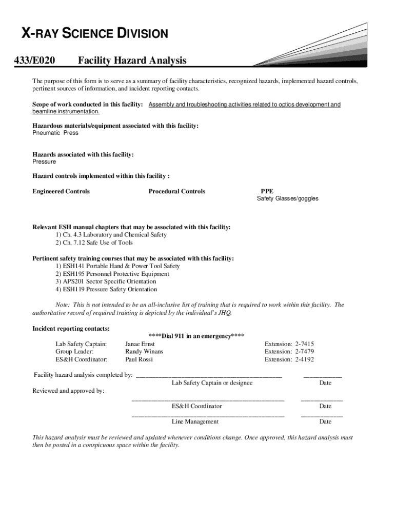 XRAY SCIENCE DIVISION 433/E020Facility Hazard AnalysisThe purpose of this form is to serve as a summary of facility characteristics, recognized hazards, implemented hazard controls, pertinent sources