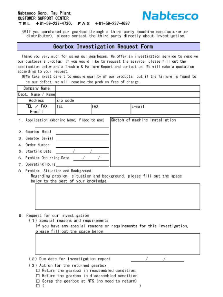 Nabtesco Corp. Tsu Plant CUSTOMER SUPPORT CENTER 81592374730 81592374697If you purchased our gearbox through a third party (machine manufacturer or distributer), please contact the third party directly
