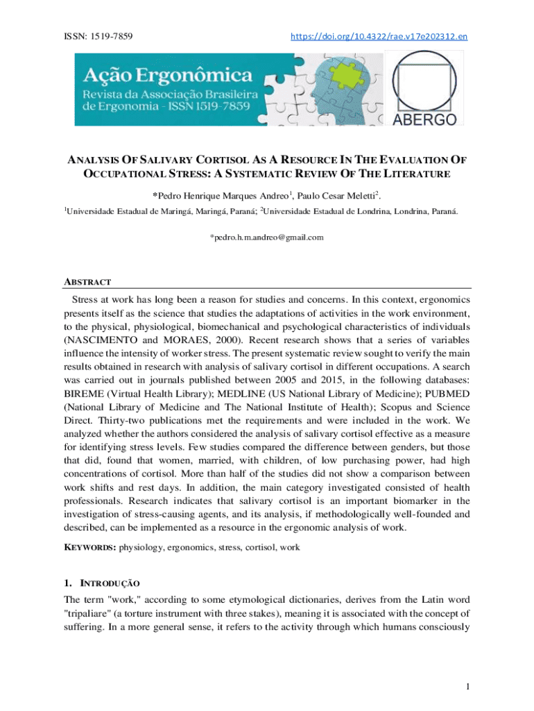 ISSN: 15197859https://doi.org/10.4322/rae.v17e202312.enANALYSIS OF SALIVARY CORTISOL AS A RESOURCE IN THE EVALUATION OF OCCUPATIONAL STRESS: A SYSTEMATIC REVIEW OF THE LITERATURE *Pedro Henrique Marques