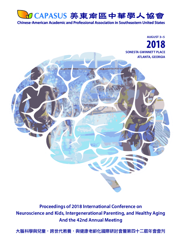 This document contains the proceedings of the 42nd CAPASUS Annual Meeting and International Conference, held from August 3-5, 2018, at Sonesta Gwinnett Place, Atlanta, Georgia. The conference focused on themes of neuroscience in learning, healthy aging, and intergenerational parenting, featuring a diverse range of presentations from experts in these fields. It aimed to promote intellectual interaction and collaboration between the scientific communities in the U.S. and Taiwan.