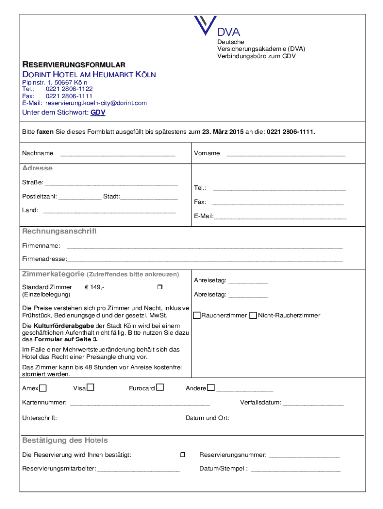 Deutsche Versicherungsakademie (DVA) Verbindungsbro zum GDVRESERVIERUNGSFORMULAR DORINT HOTEL AM HEUMARKT KLN Pipinstr. 1, 50667 Kln Tel.: 0221 28061122 Fax: 0221 28061111 EMail: reservierung.koelncity@dorint.comUnter