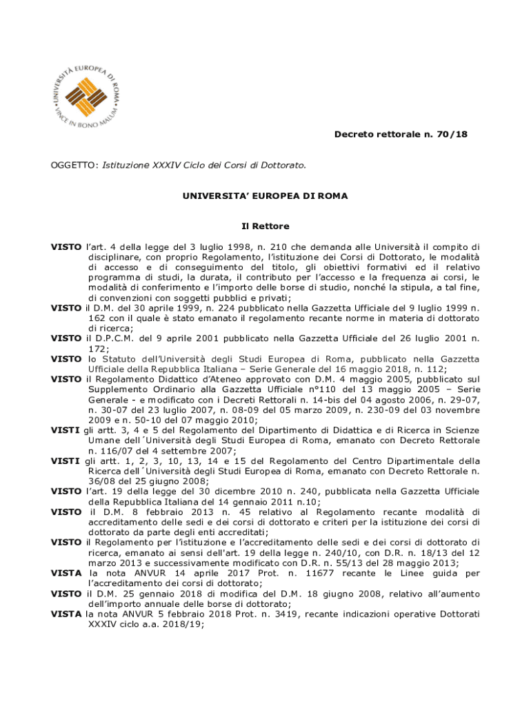 Decreto rettorale n. 70/18 OGGETTO: Istituzione XXXIV Ciclo dei Corsi di Dottorato. UNIVERSITA EUROPEA DI ROMA Il Rettore VISTO lart. 4 della legge del 3 luglio 1998, n. 210 che demanda alle Universit