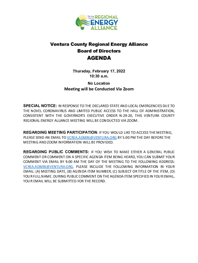 Ventura County Regional Energy Alliance Board of DirectorsAGENDA Thursday, February 17, 2022 10:30 a.m. No LocationMeeting will be Conducted Via Zoom SPECIAL NOTICE: IN RESPONSE TO THE DECLARED STATE