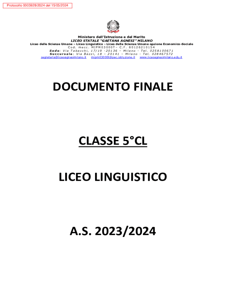 Protocollo 0005928/2024 del 15/05/2024Ministero dellIstruzione e del Merito LICEO STATALE GAETANA AGNESI MILANOLiceo delle Scienze Umane Liceo Linguistico Liceo delle Scienze Umane opzione EconomicoSociale