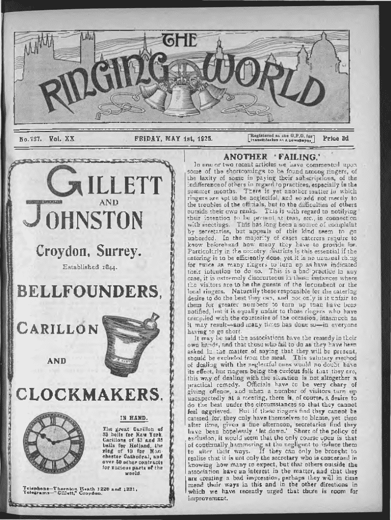 No. 737 .Y ol. X XFRID AY, MAY 1 st, 1 9 2 5 .[ transm ission as a new sp a p er,!ANO TH ERILLETT J OHNSTON iragracsBA N DCroydon, Surrey. E sta b lish e d 1844.BELLFOUNDERS, C arillo n ANDCLOCKMAKERS.