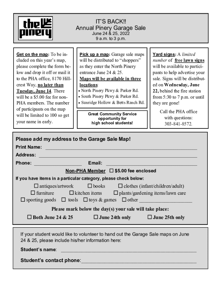This document serves as a registration form for participants of the Annual Pinery Garage Sale, scheduled for June 24 & 25, 2022. Participants can include their addresses on the garage sale map and indicate the types of items they will sell. There is a fee for non-PHA members and a limited number of spots on the map.