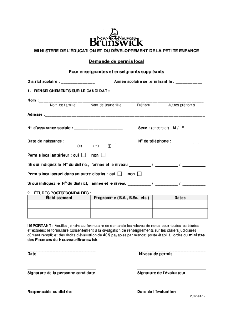 MINISTERE DE L\'DUCATION ET DU DVELOPPEMENT DE LA PETITE ENFANCEDemande de permis local Pour enseignantes et enseignants supplants District scolaire : ___Anne scolaire se terminant le : ___1. RENSEIGNEMENTS