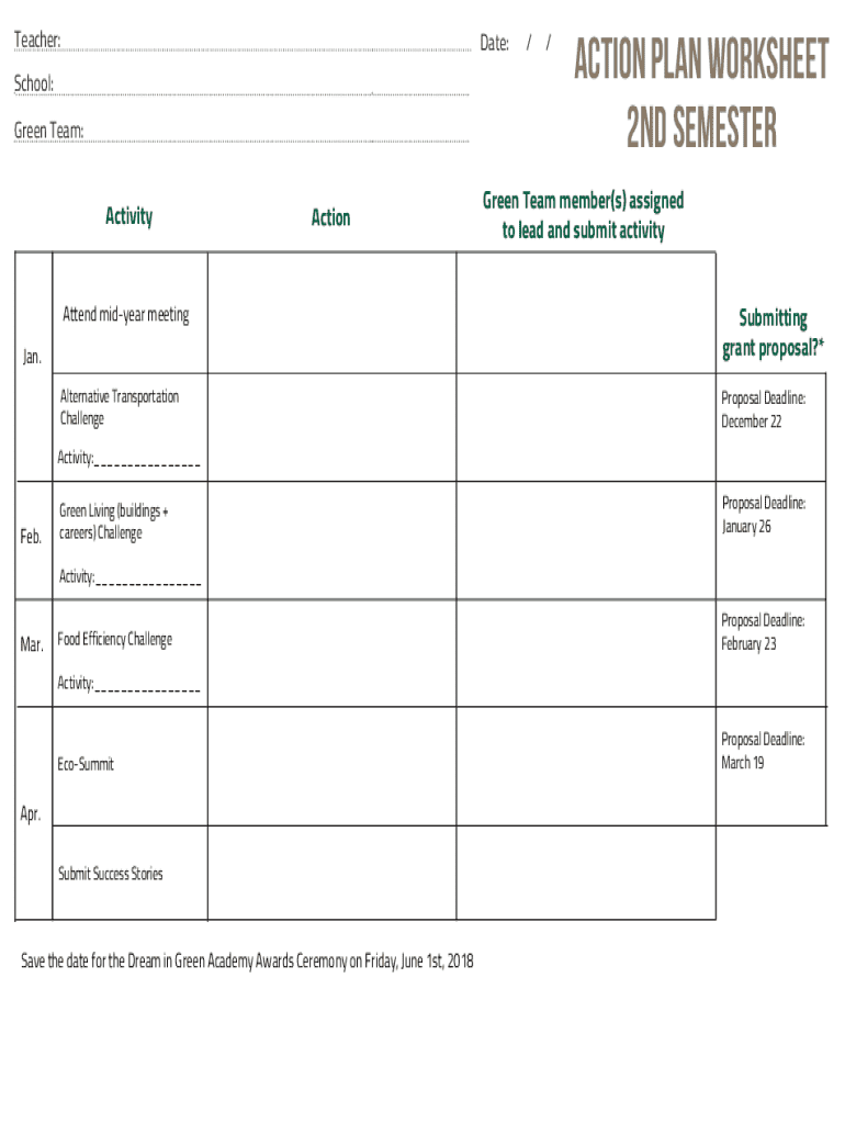 Teacher:Date:School: Green Team:ActivityAction//Action Plan Worksheet 2nd semesterGreen Team member(s) assigned to lead and submit activityAttend midyear meetingSubmitting grant proposal?*Alternative