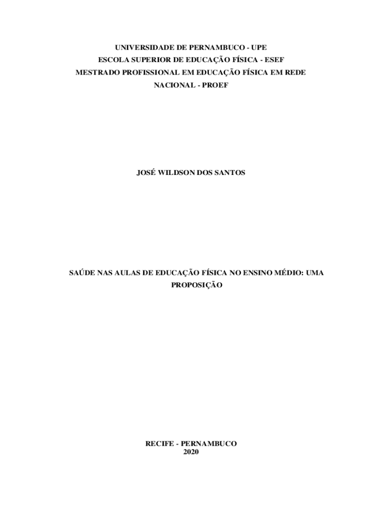 UNIVERSIDADE DE PERNAMBUCO UPE ESCOLA SUPERIOR DE EDUCAO FSICA ESEF MESTRADO PROFISSIONAL EM EDUCAO FSICA EM REDE NACIONAL PROEFJOS WILDSON DOS SANTOSSADE NAS AULAS DE EDUCAO FSICA NO ENSINO MDIO: