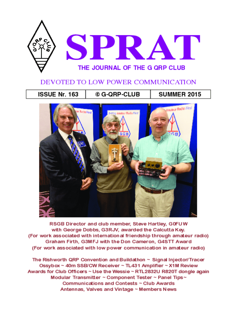 This is the summer 2015 issue of SPRAT, the journal of the G QRP Club, focusing on low power communication. It includes various articles on projects, member achievements, contest announcements, and technical information relevant to amateur radio enthusiasts.