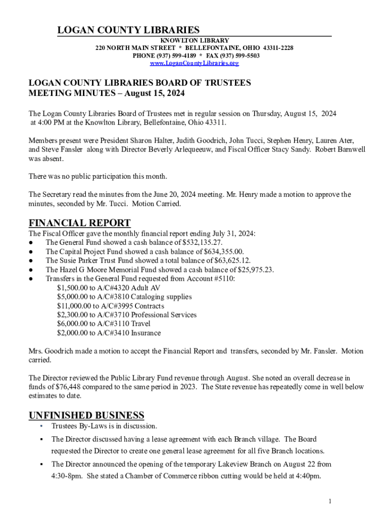 Minutes from the Logan County Libraries Board of Trustees meeting held on August 15, 2024, at the Knowlton Library in Bellefontaine, Ohio. This document includes discussions on financial reports, unfinished and new business, director\'s report, and statistics for the library\'s performance.